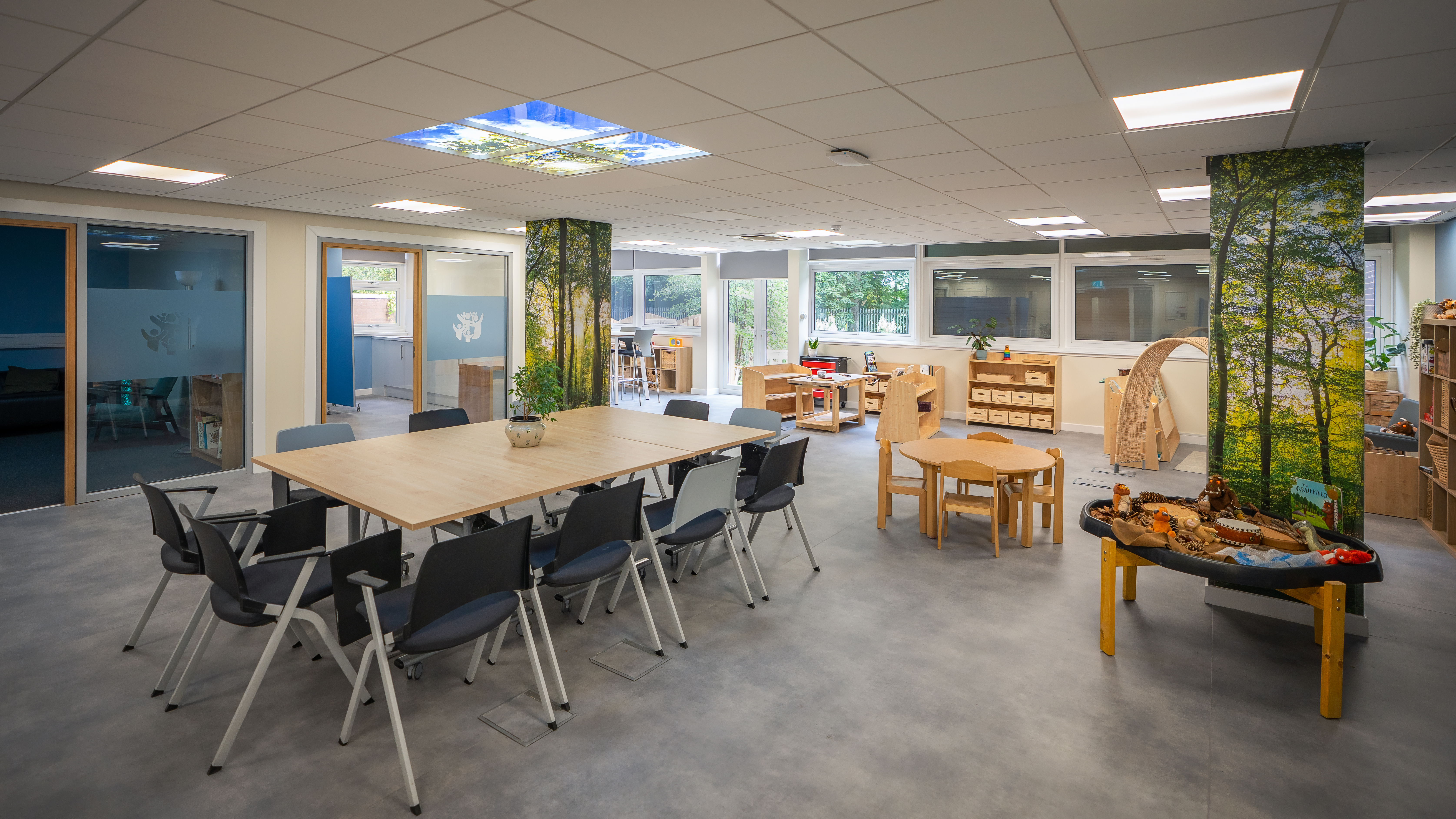 The space, which came about as a result of increased demand for Childhood Practice courses, features lots of open space and outdoor inspired design touches, to improve focus and mental wellbeing. There are doors painted with forest scenes, alongside sky tiles on the ceiling.